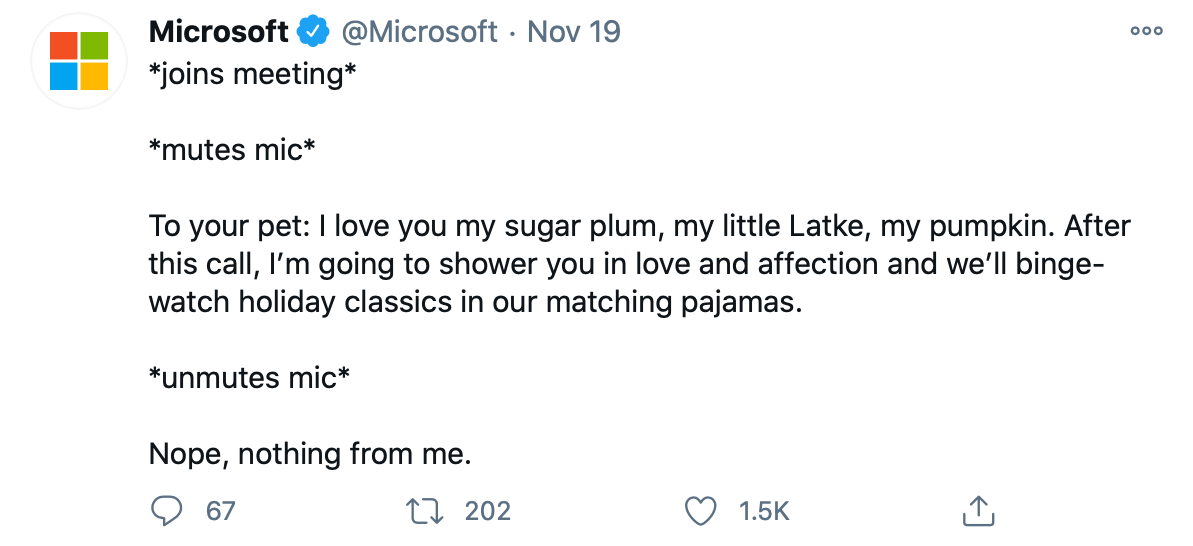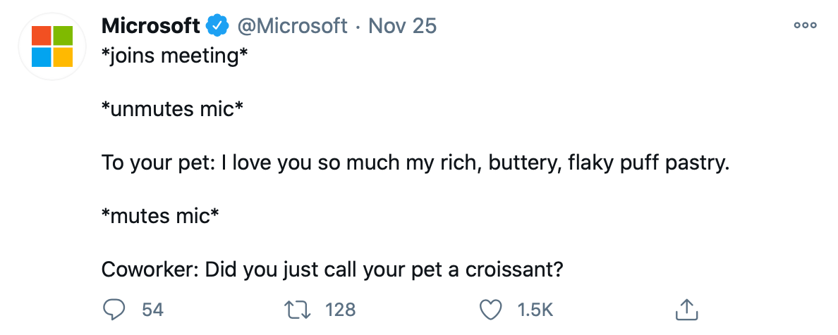 The giant that is Microsoft has mastered the relevant and lovable tweet. In the tweets below we can see how Microsoft captures office culture impeccably, which is highly relevant to their brand, while sharing the very human side of workplaces using their digital products. During a time when many are working from home and joining in work meeting through group video calls, Microsoft updated its approach on Twitter by making these highly amusing and relatable tweets.