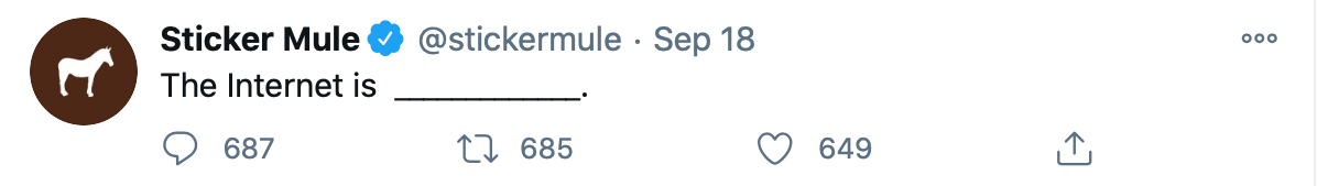 This custom sticker company has thrown themselves into social media. The great thing about their copy is that it addresses the way people use Twitter, instead of focusing on products and services. Sticker Mule has built a Twitter following based on their cultural, comical interactions on the platform. This, in turn, builds brand awareness and keeps followers eagerly following their account and looking forward to their next funny, witty tweet. When Sticker Mule wants input towards their business, has a promotion or releases new products, the audience is already loving what they stand for, through the value they have already given the audience on the platform.