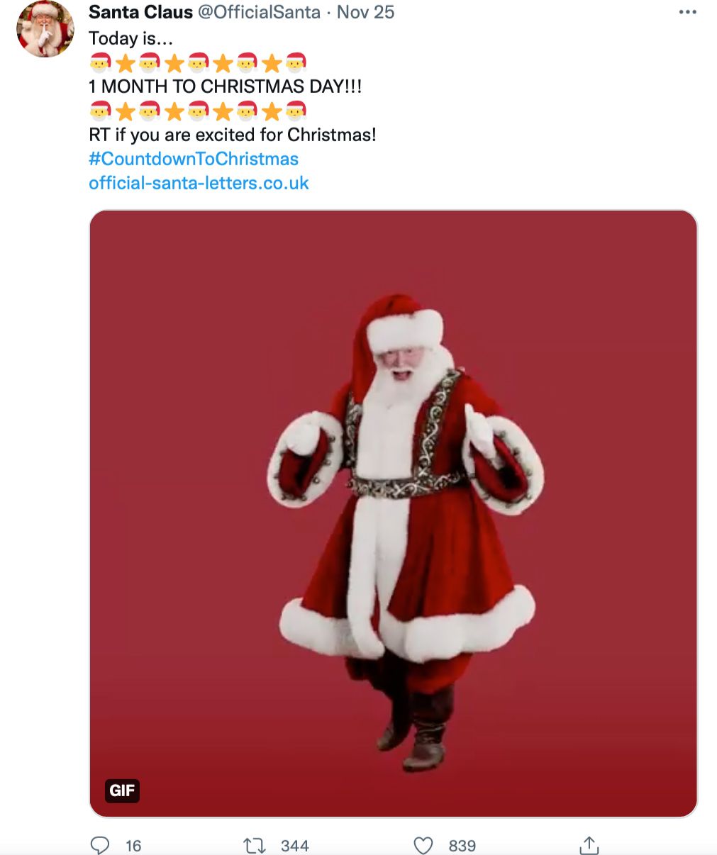 Santa Claus sprinkles magic all over its Twitter account through regularly using imagery and GIFs. Media use is sure to grab that extra bit of attention while scrolling through a feed.