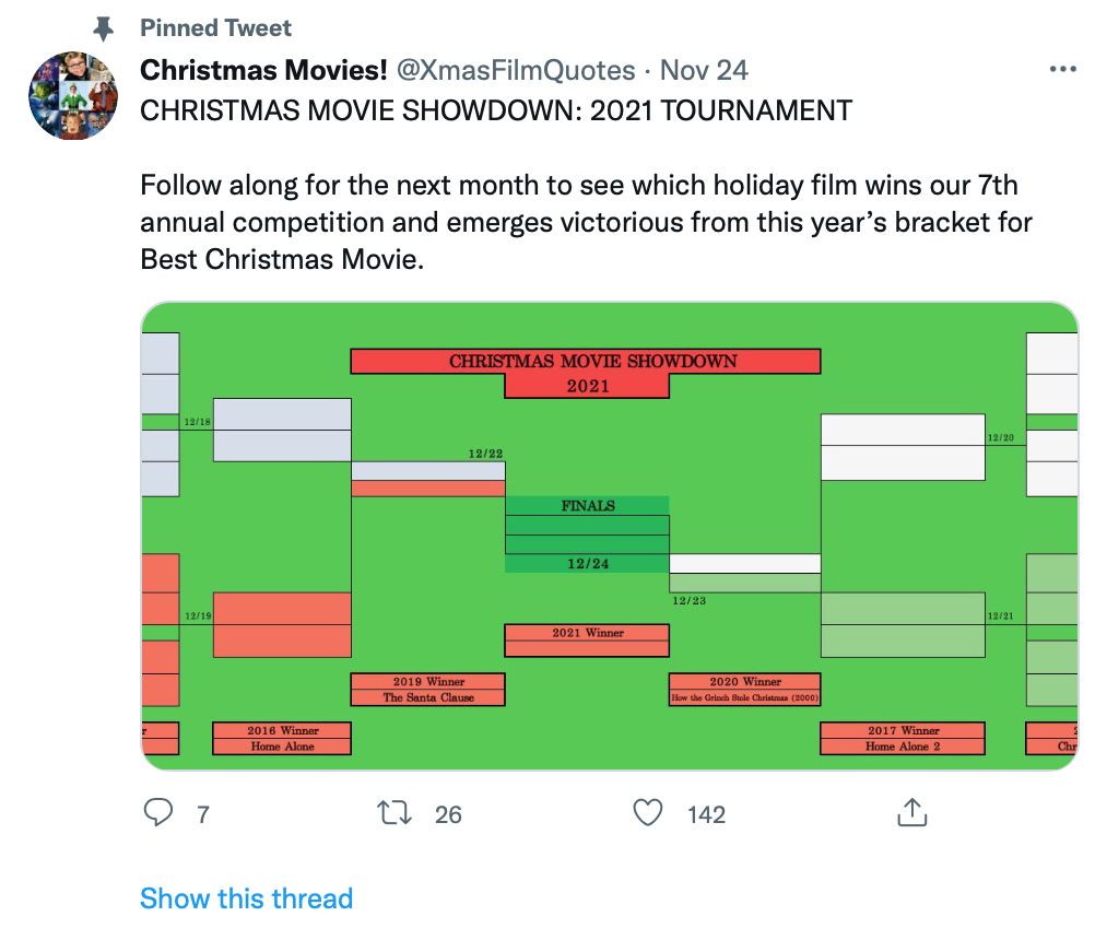 Christmas Movies! has included a fun pinned tweet, with a thread of interactive tweets attached which remains consistent with the niche. What better way to present an audience with festive fun, cheer and maybe even a little cheeky debate.