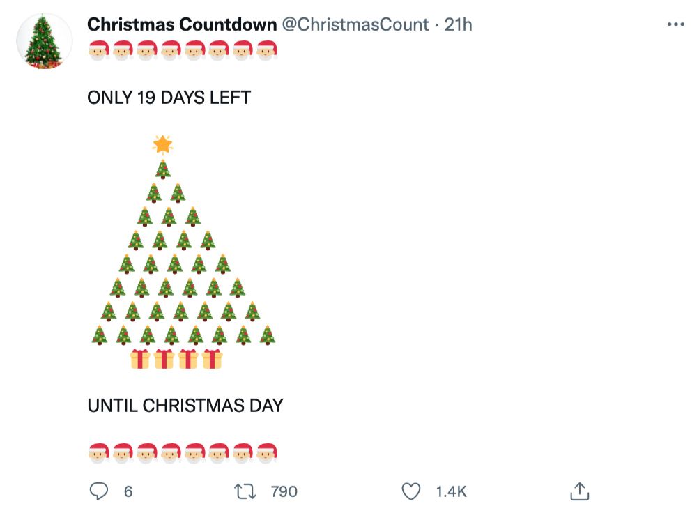 Christmas Countdown (@ChristmasCount) has the primary focus of leading the countdown of the days leading to Christmas. Think of it as your online advent calendar.