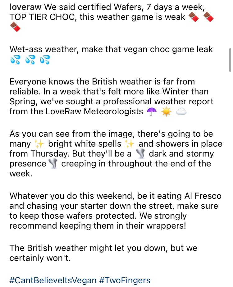 Know thy audience: one of the first commandments of getting good at social media. One incredibly smart move by @loveraw was to use imagery familiar to smartphone users. It’s extremely logical that if you are seeing their content, you are probably using a smartphone and will therefore recognise various other apps such as the weather app. From this basis, @loveraw poured out their creativity by manipulating familiar imagery in a way that is specific to their brand, humorous and in-keeping with their cheeky company voice.