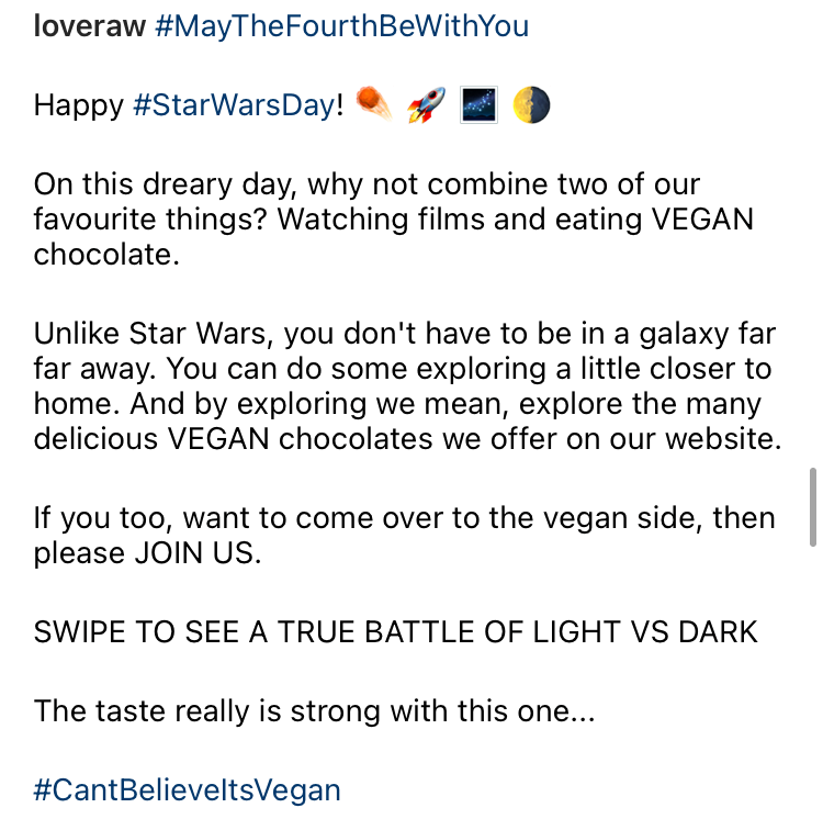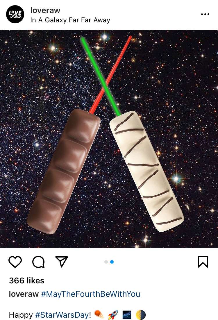 Get geeky with fandoms and popular flicks, and invite huge fan bases to associate your product with their favourite films. Star Wars one of the highest grossing film franchises in the world, so it’s a wise decision to rub off some of that popularity onto your own brand. Check out how @loveraw embraced #StarWarsDay. Notice how they added the location as ‘In A Galaxy Far Far Away’, used a text overlay on the image similar to the text at the beginning of a Star Wars film, and linked the post with their product in an imaginative, relevant way through the image and the description.