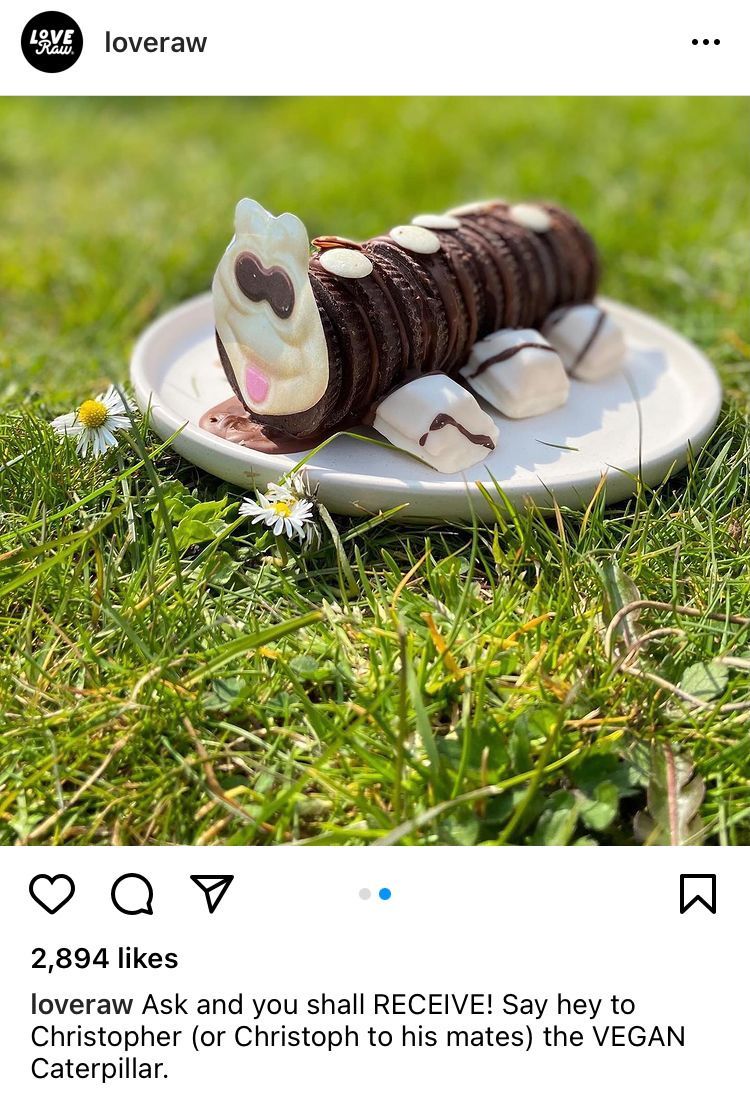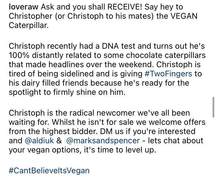 Fitting current news into your Instagram feed is a bit of an art form, but @loveraw have got it down to a tee. With the recent news about Marks and Spencers suing Aldi over caterpillar cake copyright, @loveraw found a way to drum up nearly 3000 likes, tag in the big food chains and lace their copy with vegan agenda.