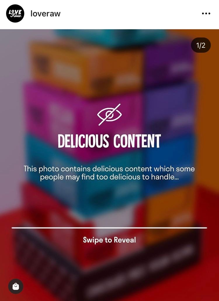 In a similar vein of thought, @loveraw have adopted imagery specific to Instagram - a sure-fire move to know the viewer will recognise the imagery. You may be familiar with the blurred screen covering content of a potentially sensitive nature. Well, @loveraw have created one of their own, which is particularly more appealing but still taps into our familiarity.