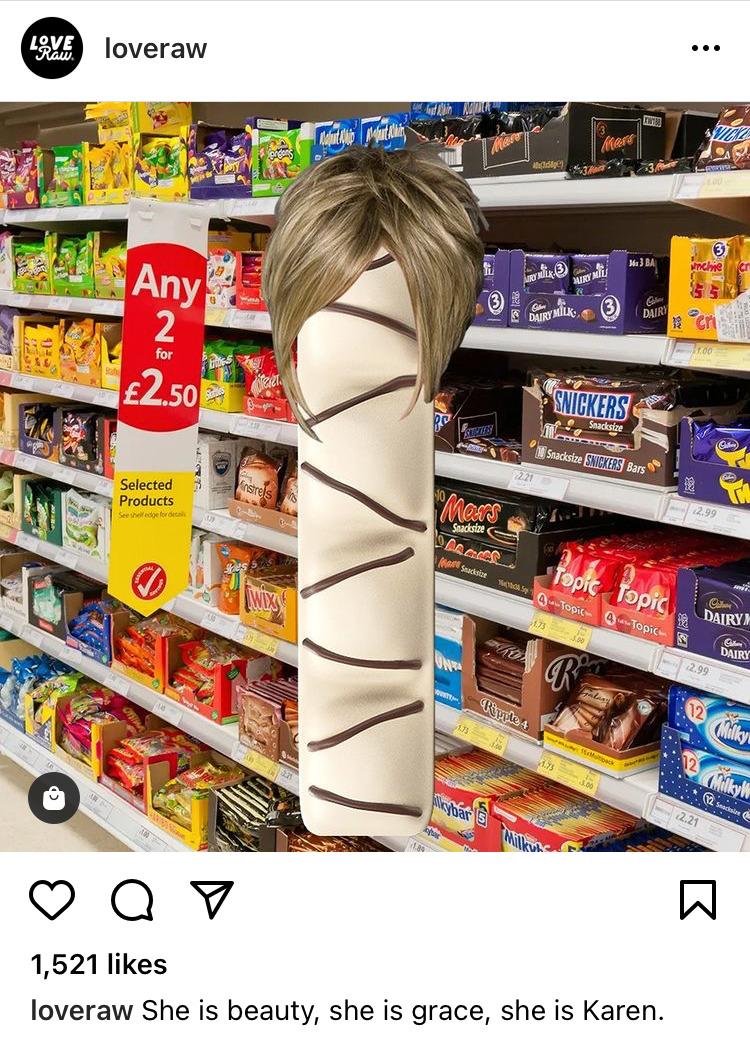 A potentially controversial choice, @loveraw urges followers to ‘BE MORE KAREN’. This widespread internet slang, suggestive of a middle-aged white woman with a bob haircut demanding to speak to the manager, has swept the internet in recent years. It’s a bold move by @loveraw to use this to their advantage, but it seems to have payed off - just look at all those likes!
