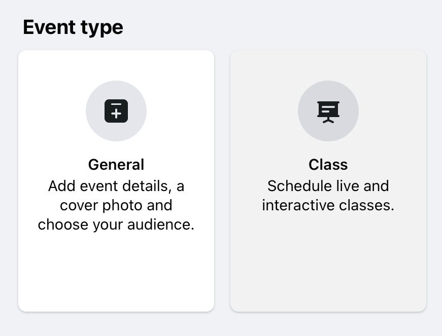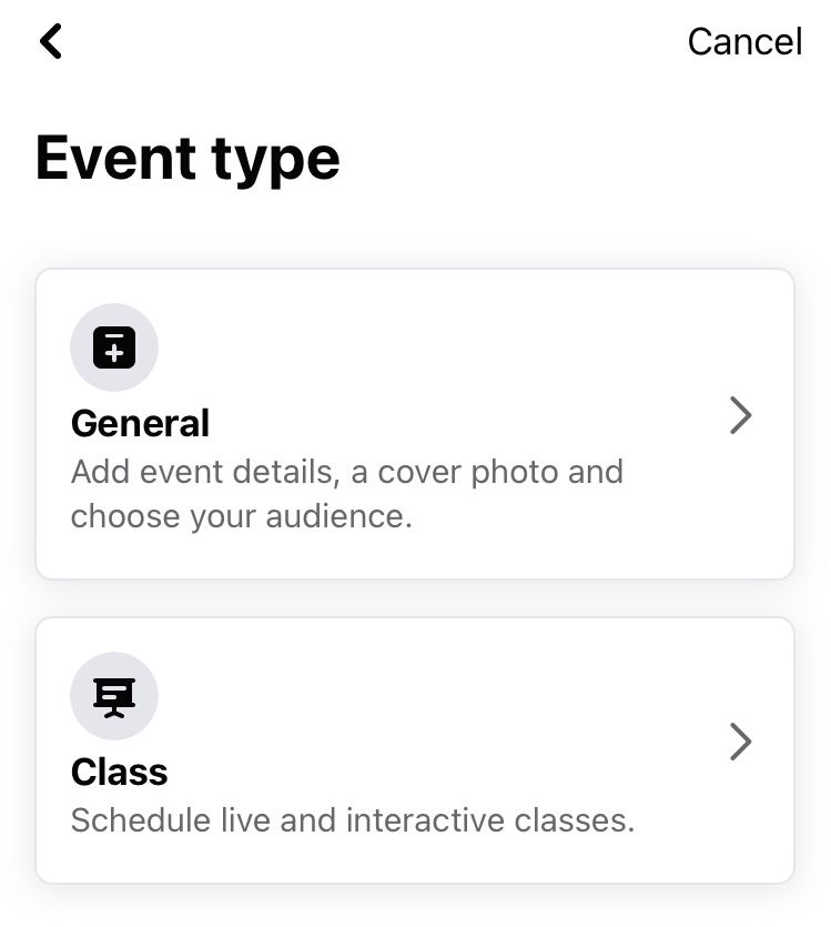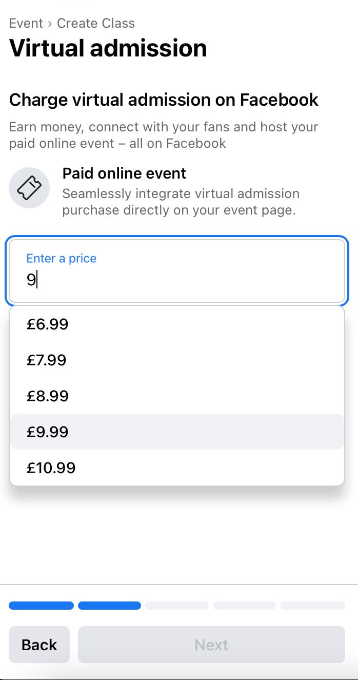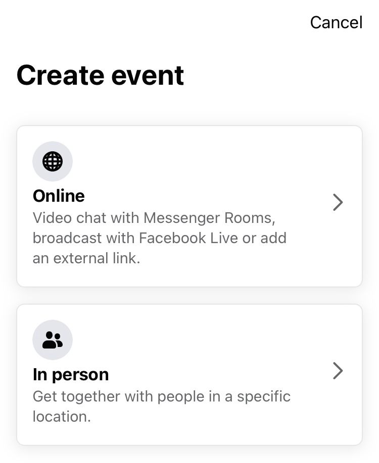 4. Choose a way for people to join the online event. This could be via Facebook Live or your own link. Then tap ‘Next’.