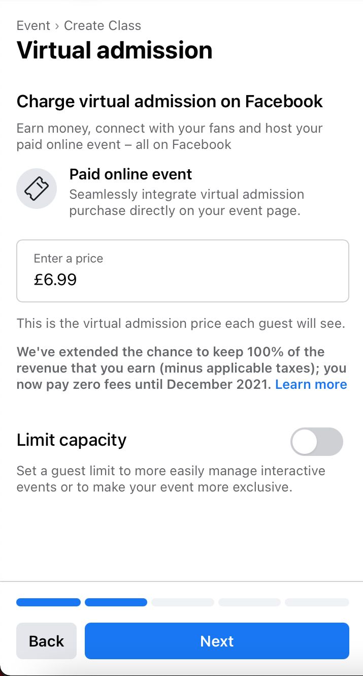5. If you have chosen a paid event, the next step is to input the price for a ticket. Once you have decided on pricing, you have the option to limit capacity for the event. You may get the option to provide an early bird discount here too. Then select ‘Next’.