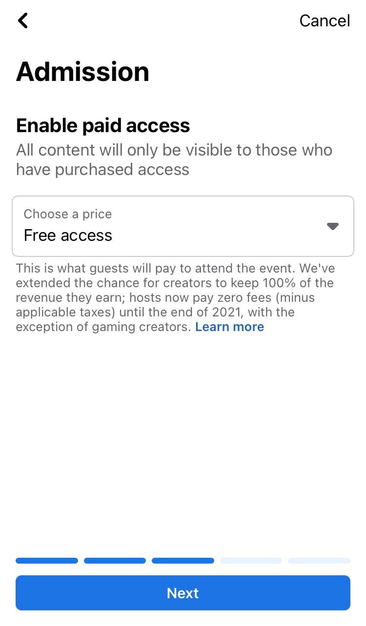 5. Choose whether your event is free or ticketed. If you want to make money from the event through Facebook, you must review and check your personal details and agree to the ‘Paid Online Events Terms of Service’. Then tap ‘Next’.