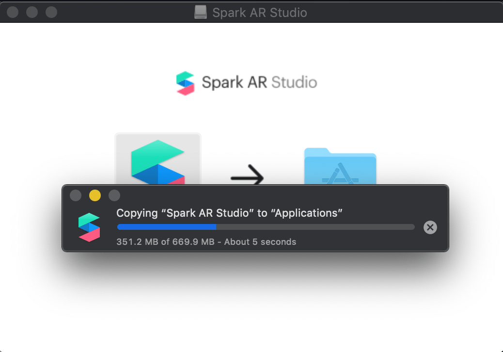 Drag the Spark AR Studio into the ‘Applications’ folder within this pop-up. Spark AR Studio will be copied into your applications.