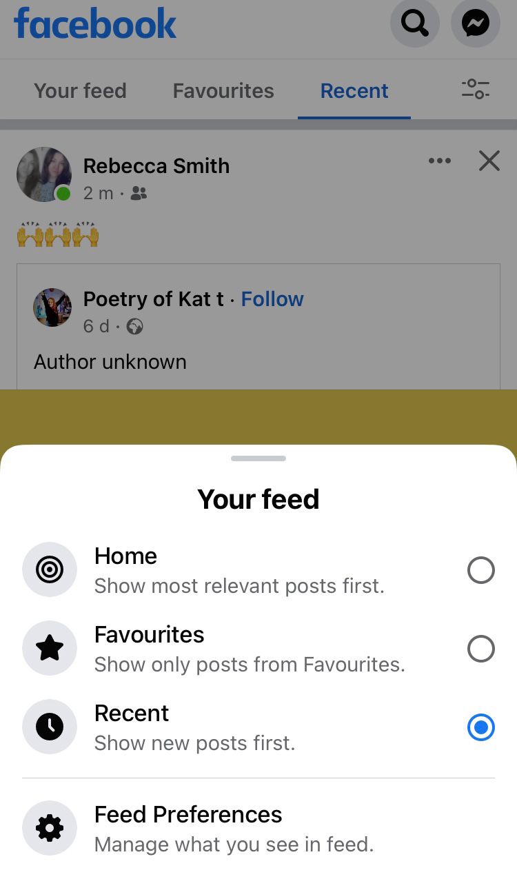 - At the top of the screen select ‘Recent’ next to ‘Your feed’ and ‘Favourites’. Alternatively, select the icon next to ‘Recent’, then tap ‘Recent’.