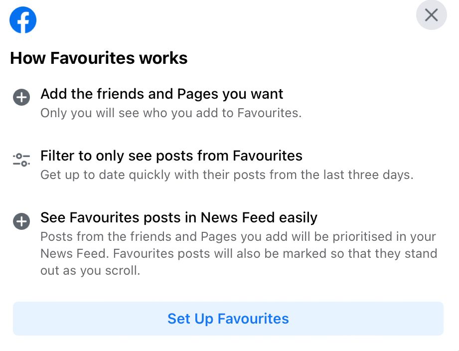 Hit the ‘Get Started’ button to set up your Favourites. Find and add the friends and Pages that matter the most to you. These will be prioritised in your regular News Feed too!