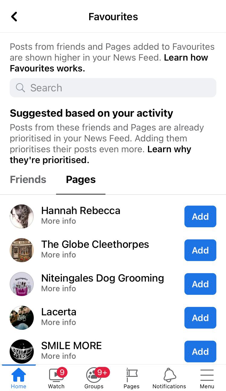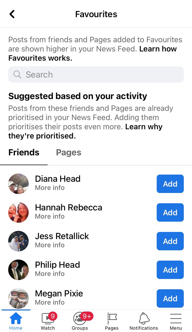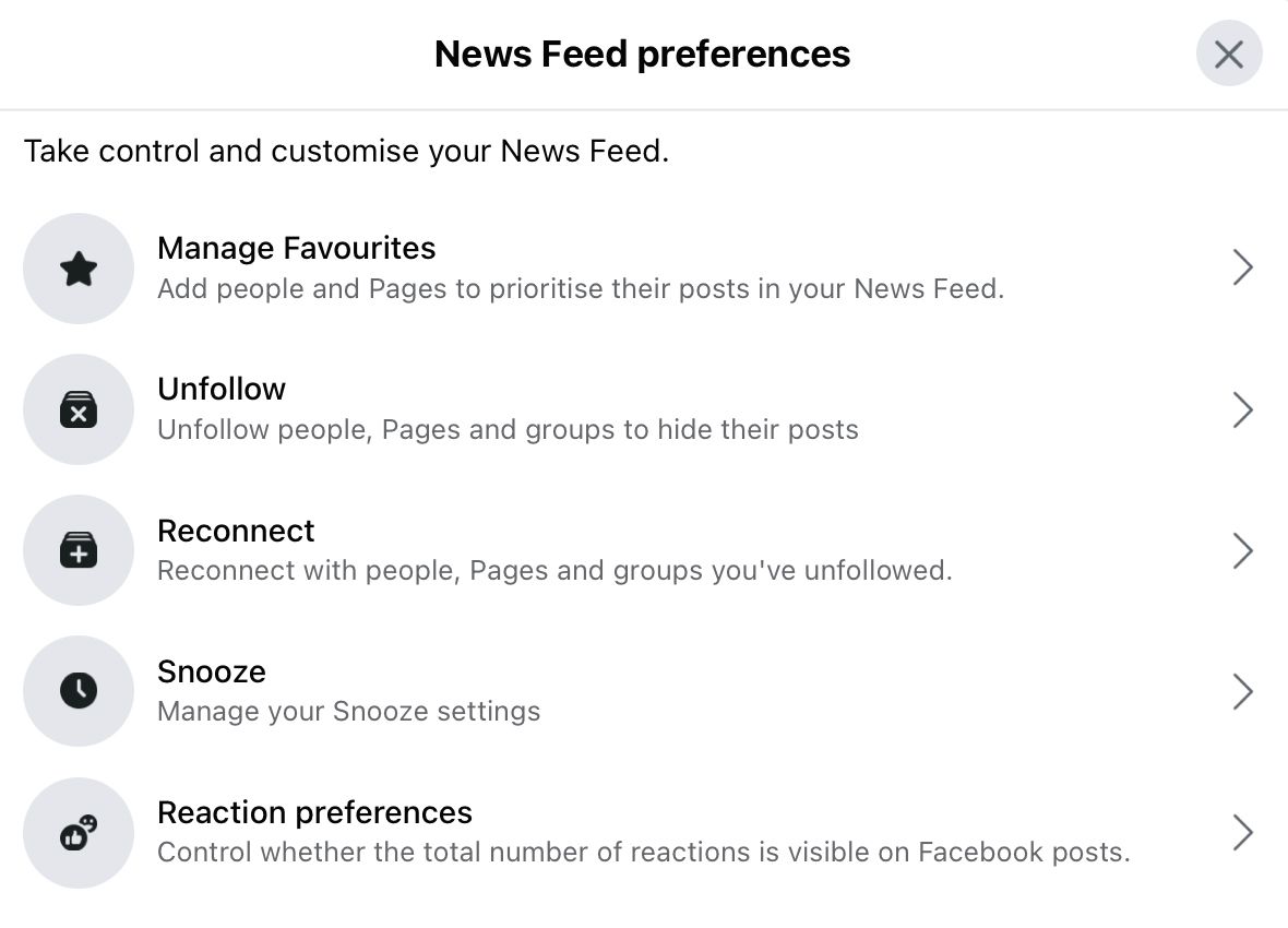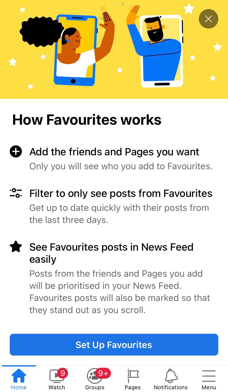 - Manage Favourites by adding people and Pages to prioritise them in your regular news feed and feature them in your unique Favourites feed.