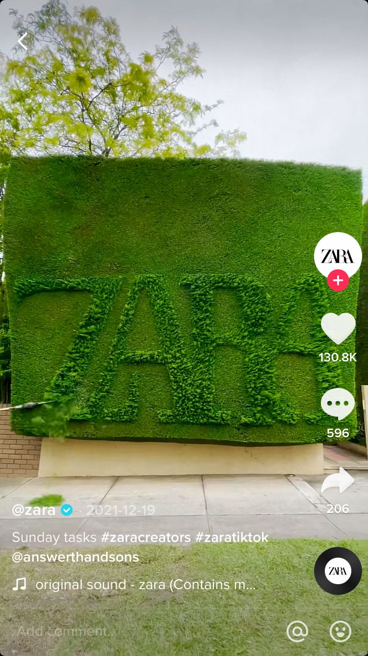 The first video currently viewable on the #zaracreators feed features the hedge trimming of the ZARA logo. ZARA has helpfully added the creator’s TikTok handle to the clip’s copy, creating a greater sense of community and giving the creator exposure with ZARA’s audience. What really strikes me is that the creator is purely a hedge cutting company. At first glance, this seems like an odd choice of creator for the fashion brand to team up with.