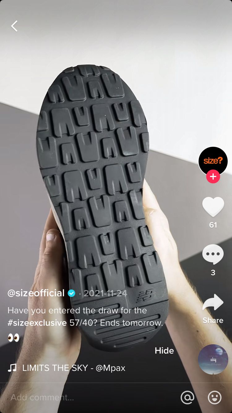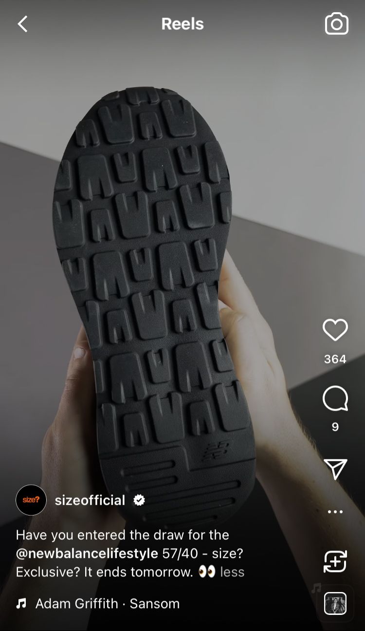 Some companies (including reeeeeally big companies) don’t hide that they’re downloading media straight from TikTok and uploading it to Instagram, evident by the big TikTok logo slapped onto the corner. This could be a strategic move to encourage viewers to check out their TikTok accounts. However, I like how Size? makes its content feel unique to the platform you’re seeing it on - with no app labels and customisation of music, hashtags and copy.