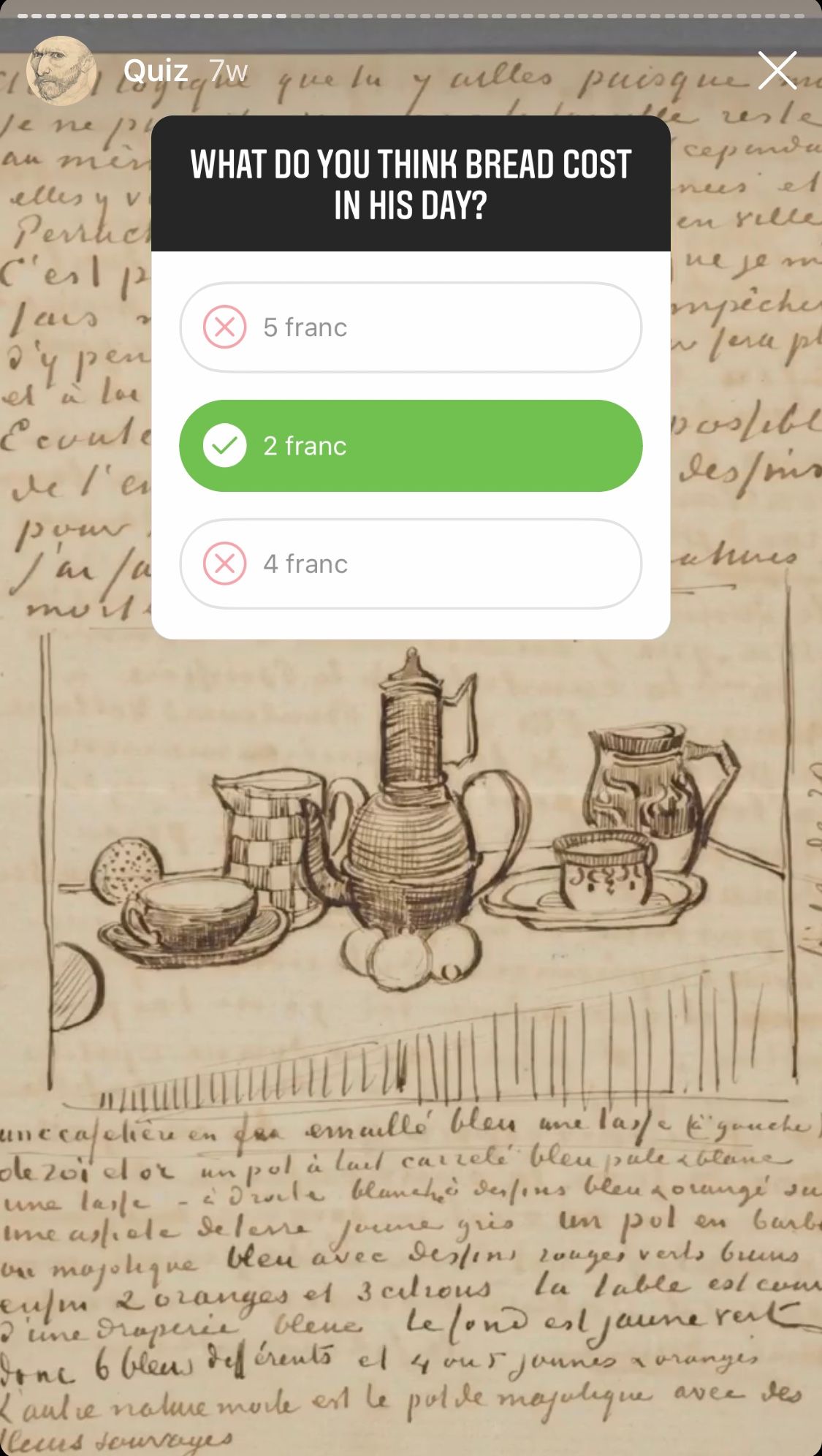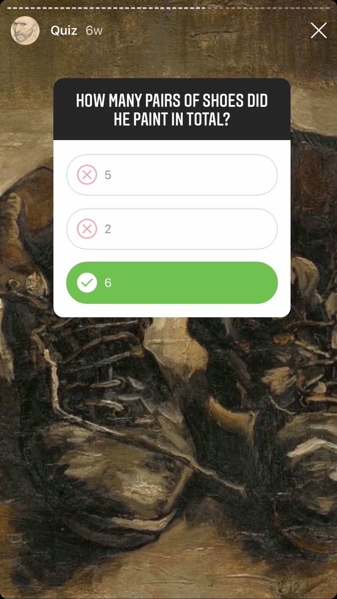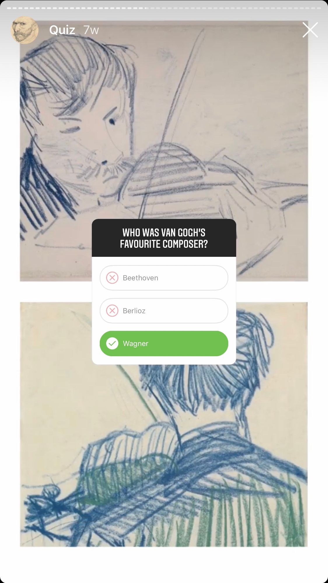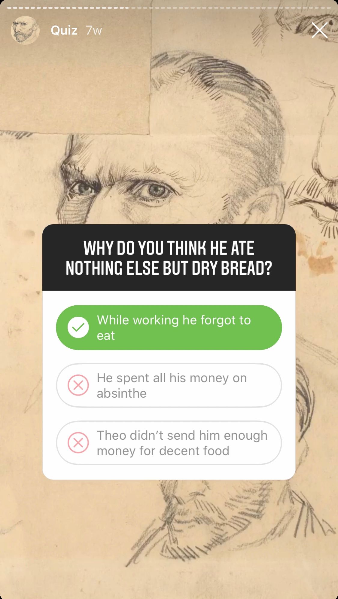 Another example of this kind of quizzing is highlighted by the Van Gogh Museum, quizzing followers about their knowledge of the life and art of this famous artist (using quiz stickers in Instagram stories).