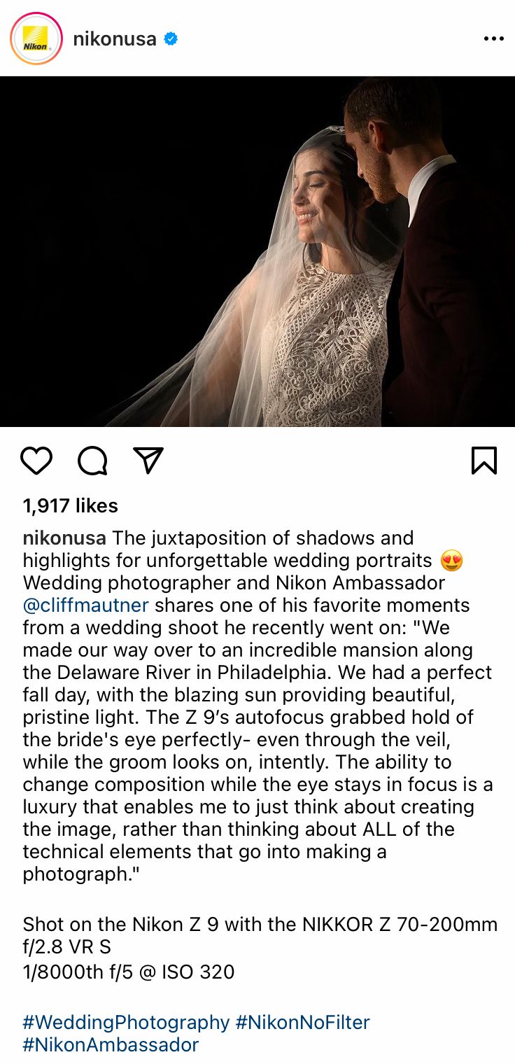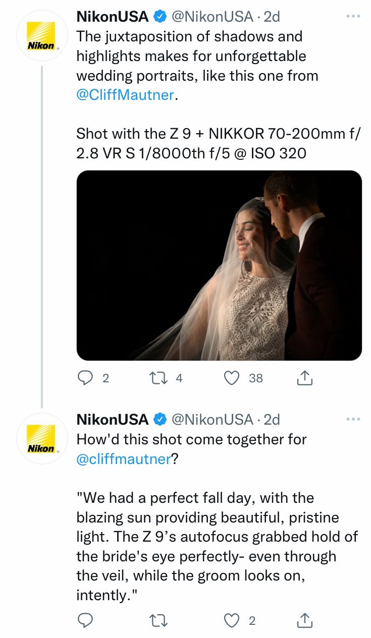 Notice how @nikonusa shares the same image on Instagram and Twitter but changes the copy for each platform. The Instagram post includes an emoji, hashtags, a longer quote and finishes with the camera information. On Twitter, the camera information is closer to the beginning of the text, there's no emojis or hashtags to be found and even with a chain of tweets, the selected details are more succinct.