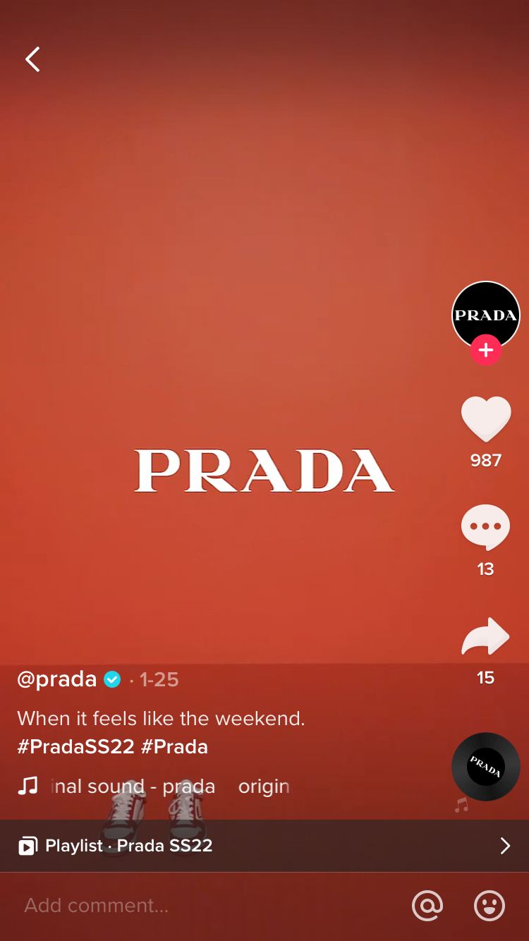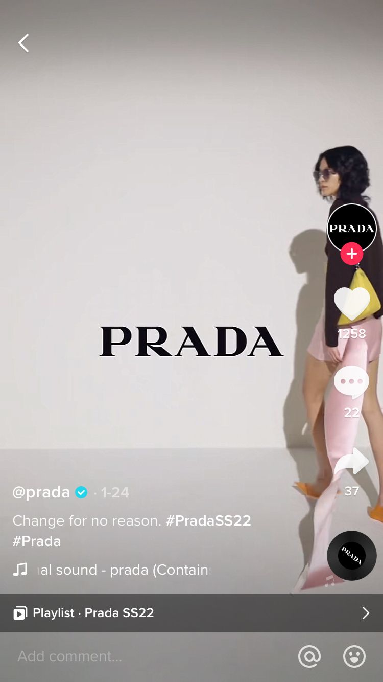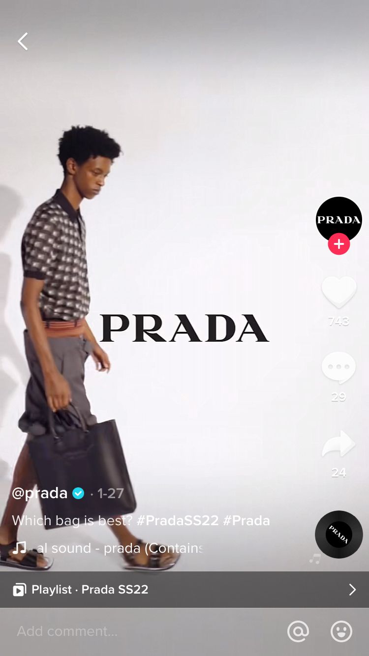 When crafting content, branding should be at the heart of how it’s presented. Think back to your visual branding. The colours, fonts, filters and feelings you want to spark should shape your content creation. You may want to include your logo as an overlay or at the end of video content. Adding a company logo to videos is something @Prada does regularly on TikTok.