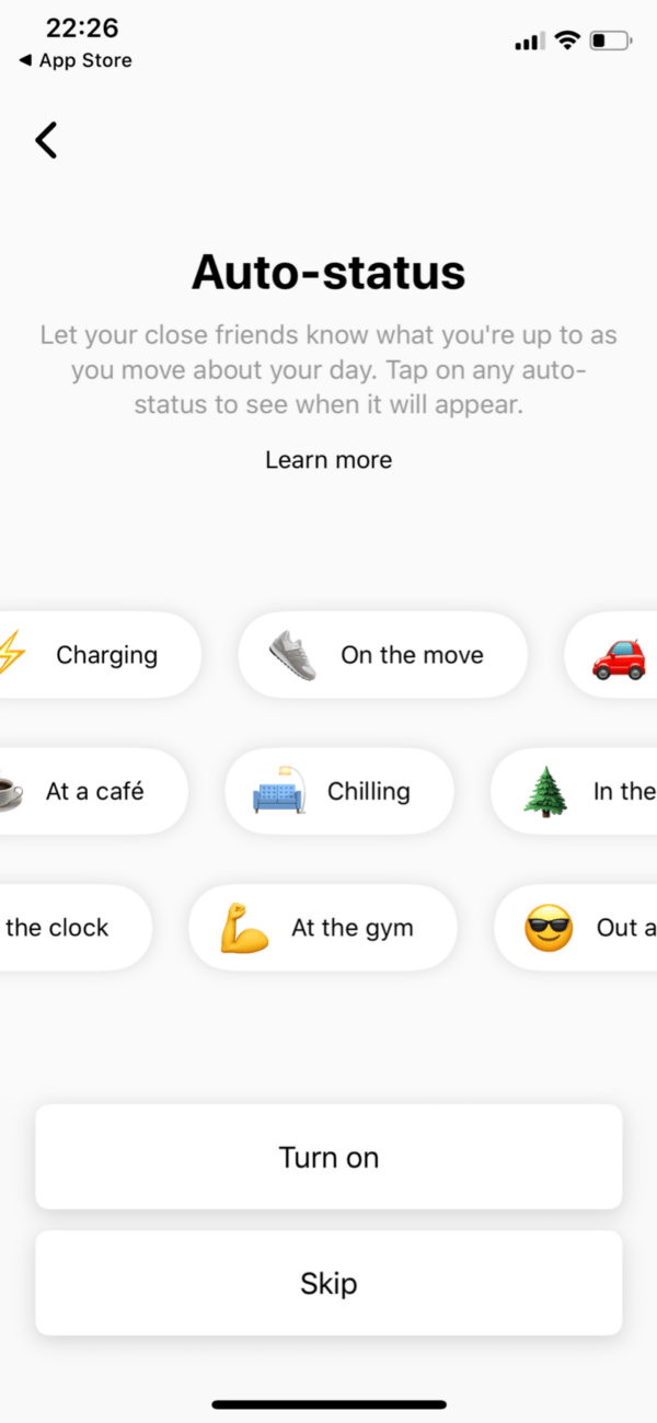 3. An interesting feature of Threads is the ability to turn on auto-status. Threads uses location, movement, battery level and network connection to create a status on the user’s behalf.
